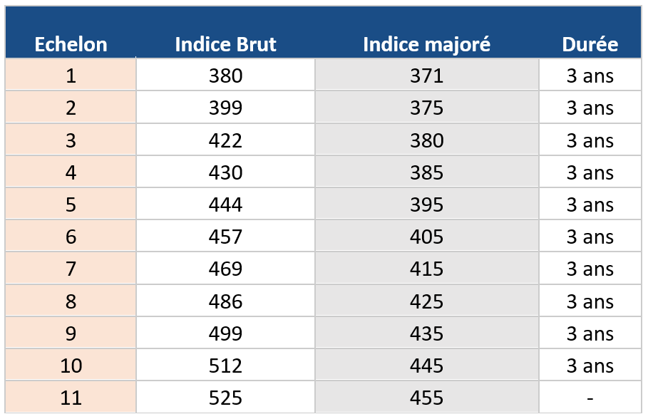 La grille indiciaire de référence actuelle est constituée de 11 échelons. Le dernier permet de gagner 84 points d’indice par rapport au niveau plancher, soit 332 euros nets par mois pour un contrat à temps complet.