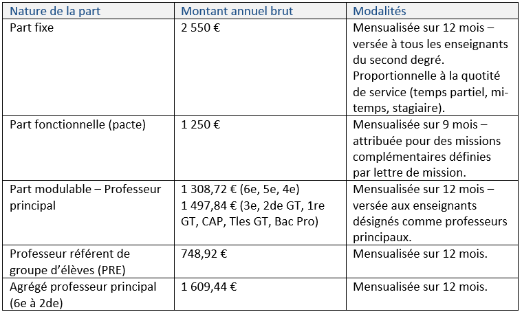 L’ISOE (second degré) est une indemnité comprenant une part fixe, commune à tous, et une part modulable attribuée aux professeurs principaux. Depuis 2023, une part fonctionnelle (liée au pacte) s’y est ajoutée.